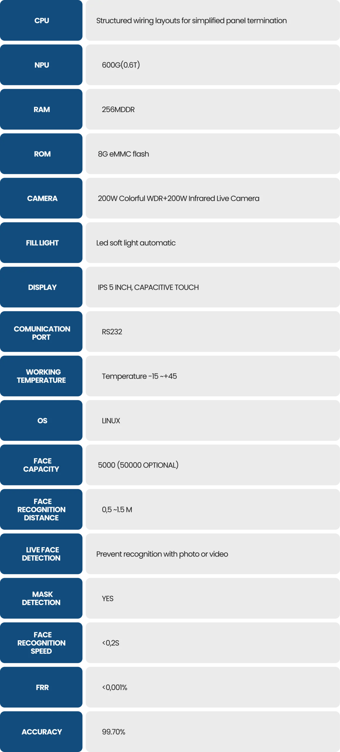 The EzAiattend interface module uses a facial recognition algorithm based on Artificial Intelligence (Deep Learning) with convolutional neural networks (CNN). The system captures the face image using visible and infrared cameras, ensuring greater accuracy and real presence detection (anti-spoofing).
